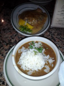 Shrimp in New Orleans are often served “BBQ” style- which there means they are cooked simply with salt and pepper, in a sauce made mostly of their own juices, and are neither cooked on a barbacue, nor grilled. They can then either be served on their own, in their cooking liquid, or in a po boy sandwich or somesuch. The BBQ shrimp that I ate at Mr. B’s Bistro were amazing; they are served in a rich, savoury sauce, which I’m certain contains quite a lot of butter. As they are served in their shells, eating them is quite a production, involving bibs and finger bowls, but don’t worry…the staff will take care of you. I enjoyed the shrimp po boy I had at Luizza’s By The Track as well, in spite of the fact that the shrimp were not deveined (okay, I know that it’s a diner, and they were small shrimp, but is that normal?). There was quite a bit of black pepper on the shrimp, but besides that, they were simply seasoned, allowing the fresh flavour of the crustaceans to shine through.