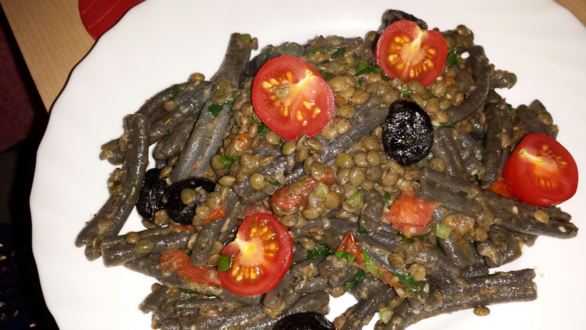 Organic squid ink pasta from Italy with organic green lentils (France), cherry and heirloom tomatoes, sundried black olives, parmigiano, zattar, lemon and Israeli olive oil.