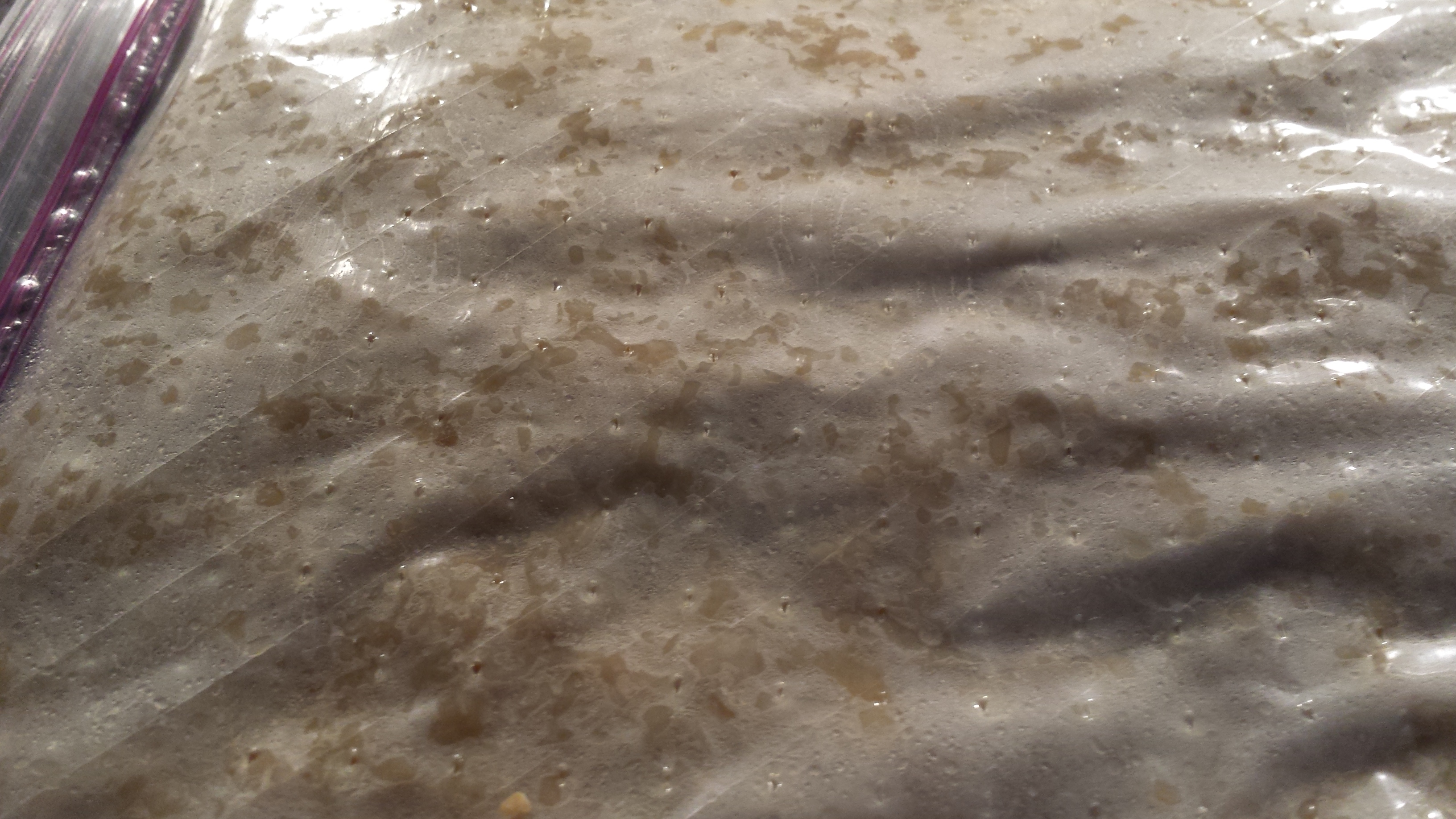 For this step you’ll need large plastic bags with holes in them. I’m using produce bags, because they come with air vents, but you can poke some holes in large zip-locks instead. Put your mix into the bags.